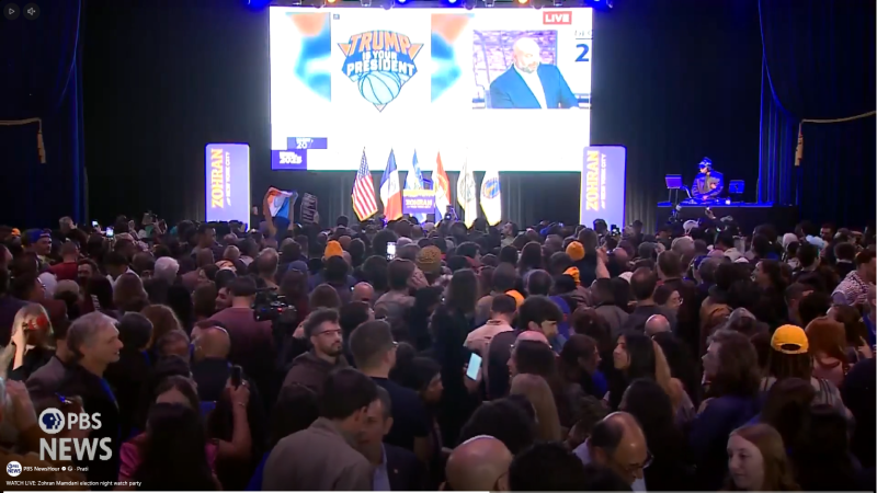 Nije, naravno, sve onako kako izgleda. Pronašli smo i snimku iz Mamdanijeva stožera na kojoj se vidi drugačija situacija. Video prijenos koji je PBS News emitirao uživo (u trajanju od preko tri sata) iz stožera pokazuje da se cijelo vrijeme na ekranu pratilo posebnu izbornu emisiju njujorškog televizijskog kanala Spectrum News (1, 2).