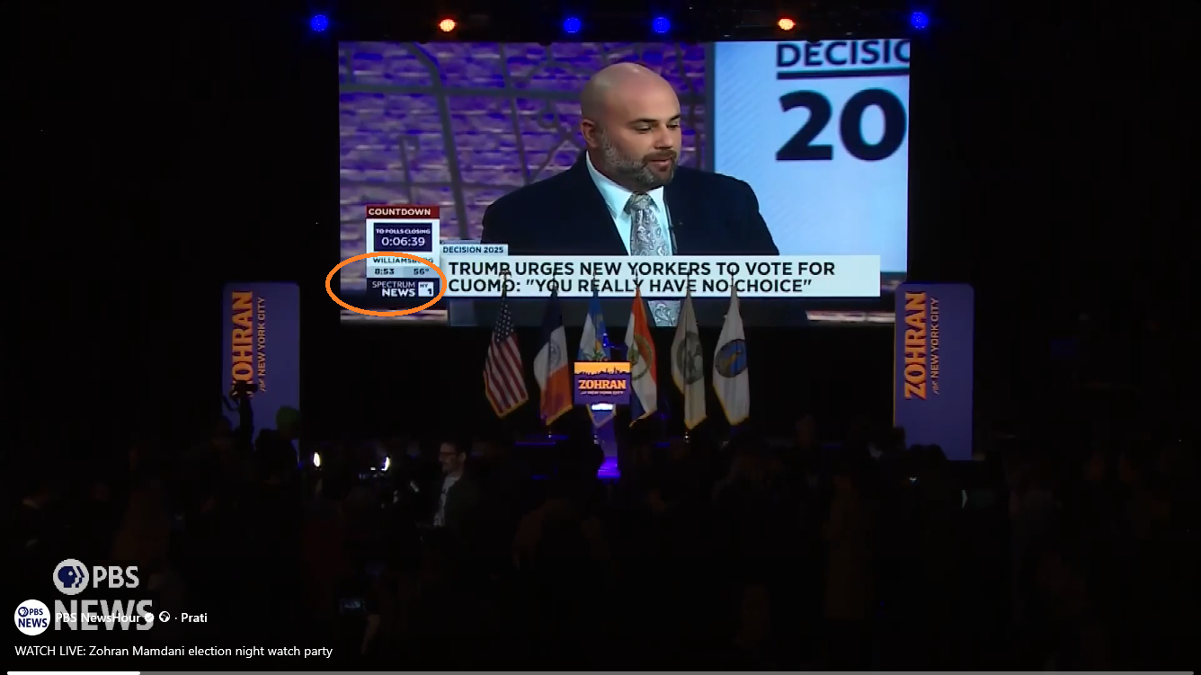 Uz to, glasnogovornik Spectrum Newsa pojasnio je kako se Trumpova poruka našla ispred Mamdanijevih pristaša. Rekao je za portal Snopes da je na ekranu prikazan prijenos Spectrum Newsa NY1 s izborne noći, koji je uključivao i raspravu o Trumpovim reakcijama: