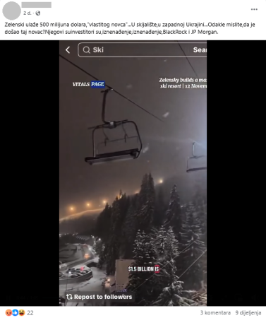 Ova laž je već proširena u prosincu prošle godine. Internetom se šire informacije da predsjednik Ukrajine, Volodimir Zelenski, navodno gradi vlastito skijalište za 1,5 milijardi dolara novcem koji su BlackRock i JP Morgan uložili u obnovu Ukrajine.
