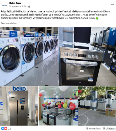 Napomena: Sretni dobitnik bit će odabran i potvrđen putem privatne poruke. 🛒🛍“, sadržaj je statusa stranice “Beko fans.” objavljenog 27. studenog 2025. godine (arhviran ovdje).