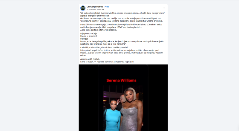 Instagram stranica Otkrivanje Matrixa u svojoj je objavi 18. studenog napisala je neutemeljene tvrdnje da su Serena Williams i Steffi Graf transrodne žene. Slične tvrdnje već se godinama šire o Williams, iako za to ne postoje nikakvi dokazi koji bi ih potvrdili.