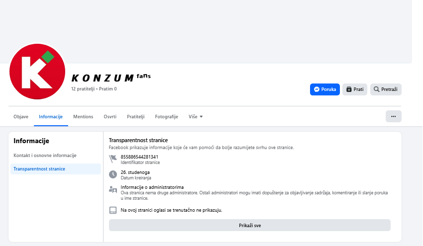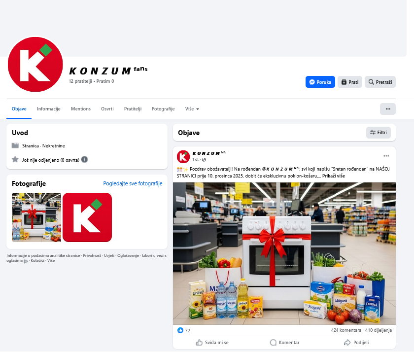 Jedini post na toj stranici poziv je na sudjelovanje u nagradnoj igri. Facebook stranica lažnog Konzuma kreirana je 26. studenog 2025. godine, a ima samo 12 pratitelja. To je jasan znak da stranica ima jednu svrhu: namamiti pratitelje na uzaludno sudjelovanje i angažiranost.