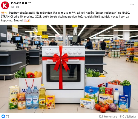 ✨ Pozdrav obožavatelji! Na rođendan @𝙆 𝙊 𝙉 𝙕 𝙐 𝙈 ᶠᵃⁿˢ, svi koji napišu “Sretan rođendan” na NAŠOJ STRANICI prije 10. prosinca 2025. dobit će ekskluzivnu poklon-košaru, električni štednjak, novac i bon za kupovinu. Sretno! 🎂“, sadržaj je posta koji je 2. prosinca 2025. godine objavila Facebook stranica “K O N Z U M fans” (arhiviran ovdje).