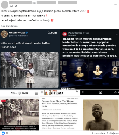 Među manipulativnim tvrdnjama je i ona da je nacistički vođa Adolf Hitler bio prvi svjetski državnik koji je zabranio tzv. “ljudske zoološke vrtove”, rasističku kolonijalnu praksu iz 19. i 20. stoljeća.