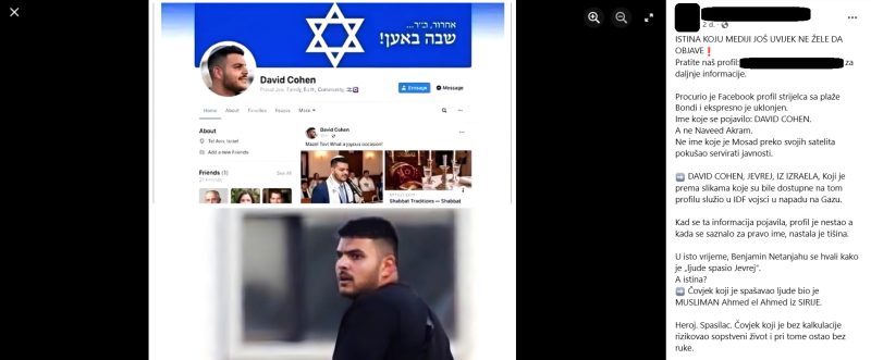 Korisnici društvenih mreža objavljuju i prenose netočnu informaciju (arhivirano ovdje, ovdje, ovdje i ovdje) da je jedan od terorista koji su 14. prosinca 2025. godine ubili 15 ljudi na plaži Bondi u australskom gradu Sidneyju po etničkoj pripadnosti Židov, odnosno da se zove David Cohen. Kao dokaz priložen je screenshot na kojem se vidi Facebook profil s fotografijom jednog od napadača pod Davidovom zvijezdom. Korisnik Facebooka koji dijeli ovu dezinformaciju u opisu piše: