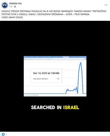 GOOGLE TRENDS PRETRAGA POKAZUJE DA JE IME BONDI NAPADAČA “NAVEED AKRAM” PRETRAŽENO STOTINE PUTA U IZRAELU, IRANU I SJEDINJENIM DRŽAVAMA – JUČER – PRIJE NAPADA“, stoji u opisu posta koji je 14. prosinca 2025. godine objavljen na Facebook stranici Politički Vrh (arhiviran ovdje).