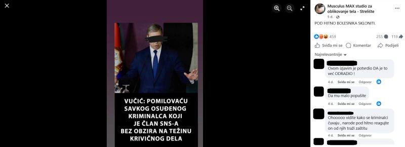 “Pomilovat ću svakog osuđenog kriminalca koji je član SNS-a bez obzira na težinu krivičnog djela”. U opisu objave korisnik je napisao: “Pod hitno bolesnika treba skloniti”.