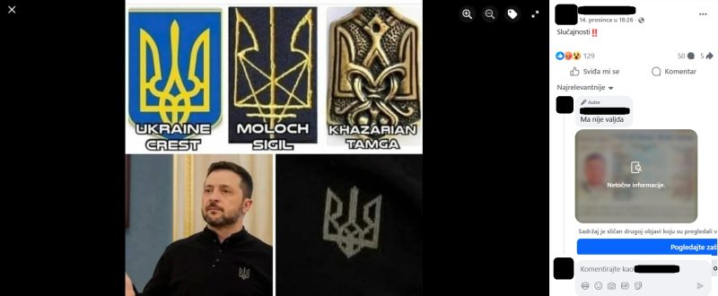 Korisnik društvene mreže Facebook 14. prosinca objavio je kolaž od pet fotografija (arhivirano ovdje), pri čemu je na prvoj fotografiji ukrajinski simbol “Trozub”, na drugoj sličan simbol ispod kojeg piše Molohov pečat (Moloch Sigil), a na trećoj Hazarska tamga, simbol koji se pripisuje Hazarskom kaganatu, nomadskoj/turkijskoj državi koja je nastala u sedmom stoljeću na području uz Kaspijsko i Crno more na istok do rijeke Urala, na sjever do srednje Volge i Oke, na zapad do Buga i Dnjepra.