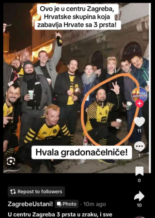 Na dočeku Nove godine u Zagrebu, organiziranom na Trgu bana Jelačića, svirao je glazbeni sastav Dubioza Kolektiv. Društvenim mrežama uskoro se počela širiti fotografija koja prikazuje članove Dubioze Kolektiva na kojoj jedan od članova benda, Brano Jakubović, drži podignuta tri prsta.