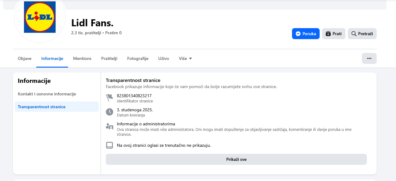 Ova Facebook stranica kreirana je 3. studenog 2025. godine. Ima preko 2,3 tisuće pratitelja, a jedini post na toj stranici poziv je na sudjelovanje u nagradnoj igri. To je jasan znak da stranica ima jednu svrhu: namamiti pratitelje na uzaludno sudjelovanje i angažiranost.