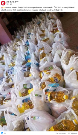 “Pozdrav svima, u čast @KONZUM-ovog rođendana, svi koji napišu ‘ČESTITKE’ na našoj STRANICI prije 20. siječnja 2026. dobit će ekskluzivne nagrade, uključujući posebnu torbu, mobitel, novac i besplatne kupone za kupovinu. Sretno“, stoji u Facebook postu koji je 14. siječnja 2026. godine otvorila stranica “K O N Z U M fans” (arhiviran ovdje).