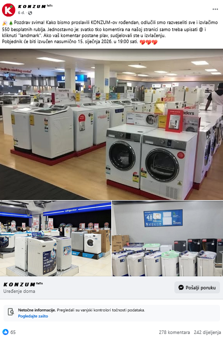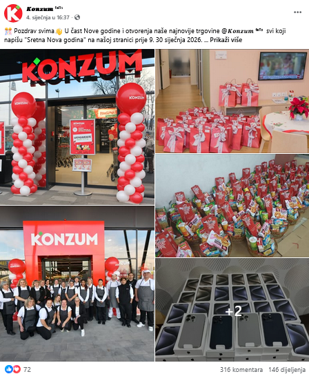 “Pozdrav svima, u čast @KONZUM-ovog rođendana, svi koji napišu ‘ČESTITKE’ na našoj STRANICI prije 20. siječnja 2026. dobit će ekskluzivne nagrade, uključujući posebnu torbu, mobitel, novac i besplatne kupone za kupovinu. Sretno“, stoji u Facebook postu koji je 14. siječnja 2026. godine otvorila stranica “K O N Z U M fans” (arhiviran ovdje).