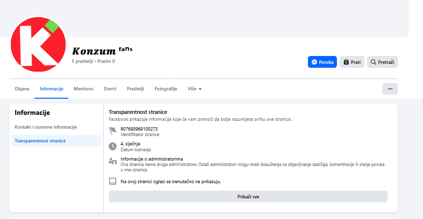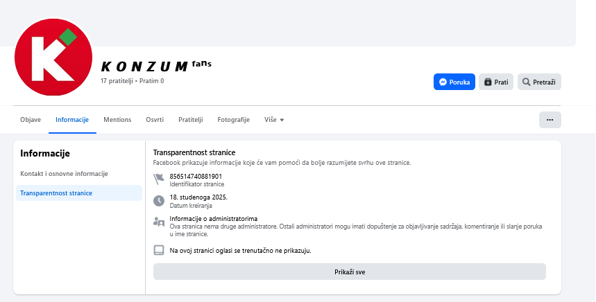 Jedini postovi na tim stranicama pozivi su na sudjelovanje u nagradnim igrama. Facebook stranice pod nazivom “K O N Z U M fans” kreirane su 3. rujna i 18. studenog 2025. i godine, a imaju mali broj pratitelja (prva 184, a druga 17). Stranica “Konzum fans” otvorena je 4. siječnja 2026. godine i ima tek pet pratitelja.