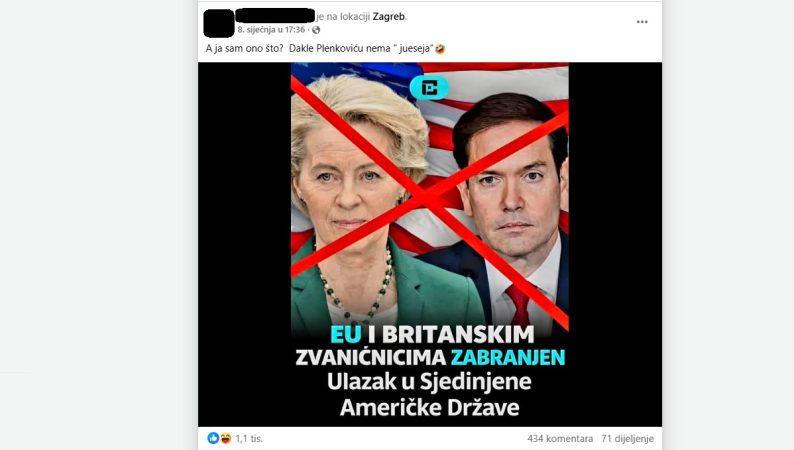 Korisnik Facebooka podijelio je 8. siječnja na svom profilu fotografiju (arhivirano ovdje) na kojoj se nalaze crvenom bojom prekriženi portreti predsjednice Europske komisije Ursule von der Leyen i državnog tajnika SAD-a Marca Rubia. U pozadini se nalazi američka zastave, a ispod portreta stoji natpis: “EU i britanskim zvaničnicima zabranjen ulazak u Sjedinjene države“. Korisnik koji je objavio ovaj sadržaj u opisu je dodao: “Dakle, Plenkoviću nema ‘jueseja’“.