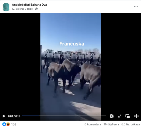 “Francuska“, natpis je na hrvatskom jeziku umetnut u Facebook-reels, dok se na kraju pojavljuje natpis na francuskom: “Kada farmeri puste bikove na organe reda“.
