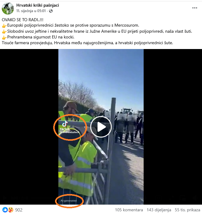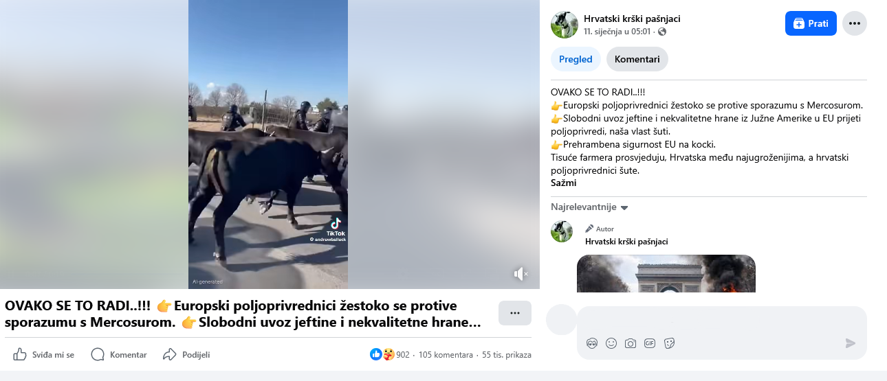 Isti video objavila je Facebook stranica “Hrvatski krški pašnjaci” uz nešto drugačiji opis, ne navodeći da se radi o Francuskoj, nego o prosvjedu europskih poljoprivrednika.