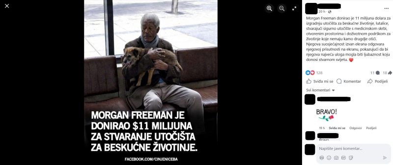 Stoga valja podvući: vijest da je američki glumac Morgan Freeman donirao 11 milijuna dolara za sklonište za životinje nema nikakvog utemeljenja. Nema relevantnog izvještaja ili izjave koji bi potvrdili takvu informaciju, a na direktan upit informacija nije potvrđena niti iz okruženja američkog glumca. U pitanju je plastičan primjer sadržaja namijenjenog viralnom širenju društvenim mrežama te ga ocjenjujemo netočnim.