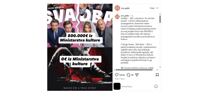 Međutim, Šeregijev film nije dobio 800.000 eura od Ministarstva kulture i medija. Putem natječaja, s tim ga je iznosom financirao Hrvatski audiovizualni centar (HAVC). To tek djelomično, ali netočno, objašnjava i sam autor objave na Instagramu. Nazivajući film “tihom velikosrpskom propagandom” koji ima poruku “ko nas bre zavadi” u statusu što prati fotografiju, piše da je film “financiran našim novcem preko Ministarstva kulture” te da „grant Hrvatskog audiovizualnog centra za ovaj projekt iznosi oko 800.000 €. Dok se publika smije, tihi utjecaj i propagandne poruke se provode kroz kulturu“.