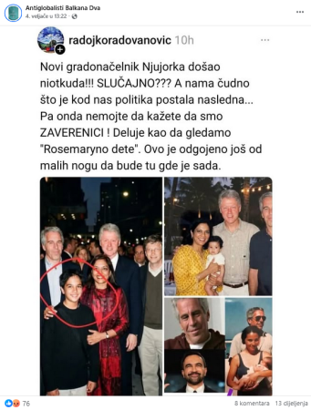 Novi gradonačelnik Njujorka došao niotkuda!!! SLUČAJNO??? A nama čudno što je kod nas politika postala nasledna… Pa onda nemojte da kažete da smo ZAVERENICI ! Deluje kao da gledamo ‘Rosemaryno dete’. Ovo je odgojeno još od malih nogu da bude tu gde je sada“, stoji u postu koji je 4. veljače 2026. godine na Facebooku objavila stranica “Antiglobalisti Balkana Dva” (arhiviran ovdje).