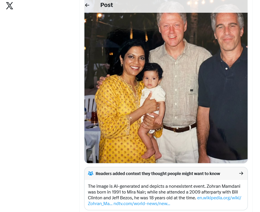 Također, na jednoj su fotografiji korisnici X-a dodali svoju opasku (community notes) da je slika generirana umjetnom inteligencijom i da prikazuje nepostojeći događaj.Zohran Mamdani rođen je 1991. godine, a majka mu je Mira Nair. Dok je ona 2009. godine prisustvovala zabavi nakon koncerta s Billom Clintonom i Jeffom Bezosom, on je tada imao 18 godina”, stoji u opasci.