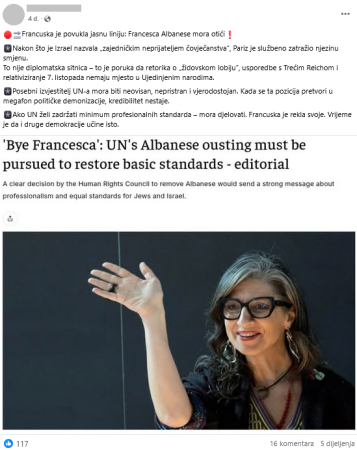Posljednjih dana ministri nekoliko europskih država, predvođeni Francuskom, reagirali su na lažne vijesti, odnosno manipuliranu snimku i pozvali Francescu Albanese, posebnu izvjestiteljicu za ljudska prava u okupiranim palestinskim teritorijima, da odstupi sa svoje dužnosti.