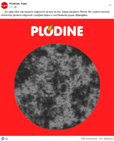 “✨ Do sada nitko nije ispravno odgovorio na broj na slici. Danas darujemo iPhone 16s i poklon-bonove onima koji ispravno odgovore i podijele objavu u sve Facebook grupe. @pengikut“, stoji u postu objavljenom 21. veljače 2026. godine preko stranice “Plodine, Fans“.
