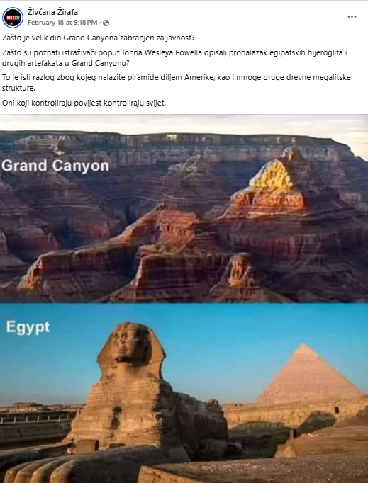 Najnovija teorija vezana uz egipatske hijeroglife i druge artefakte tiče se američkog Grand Canyona. U objavi (arhivirano ovdje) se problematizira zašto je veliki dio tog parka zabranjen za javnost: