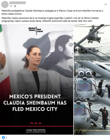 Meksička predsjednica Claudia Sheinbaum pobjegla je iz Mexico Cityja na brod meksičke mornarice u blizini obale Sonore. Meksička vojska upozorava da bi se situacija mogla pogoršati s padom noći jer se članovi kartela pregrupiraju nakon sukoba ranije danas. Meksički dužnosnik kaže da karteli neće tiho otići“, stoji u Facebook statusu objavljenom 24. veljače 2026. godine (arhiviran ovdje).
