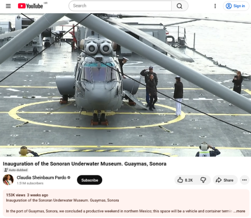 Sheinbaum je u sklopu svog radnog obilaska Sonore, sudjelovala u otvaranju muzeja i promatrala u ceremoniji kontrolirano potonuća broda koji je integriran u ovu pomorsku infrastrukturu (što se vidi i kasnije na snimci). Događaj je praćen na brodu Usumacinta, uz prisutnost civilnog, mornaričkog, vojnog i predstavnika poslovnog sektora.