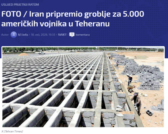 N1 Hrvatska je 18. veljače, dok su prijetnje o napadu bile još samo slovo na papiru, objavio članak (arhivirano ovdje) naslovljen “FOTO / Iran pripremio groblje za 5.000 američkih vojnika u Teheranu”, ilustrirajući članak navodnom fotografijom grobnica objavljenom na profilu Tehran Timesa na platformi X.