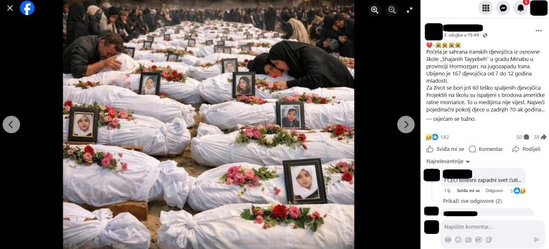 Korisnici Facebooka dijele fotografiju za koju tvrde, odnosno sugeriraju da predstavlja autentičan trenutak sa pogreba iranskih djevojčica ubijenih u raketnom napadu, kad je pogođena škola Shajareh Tayyebeh u gradu Minabu, na jugozapadu Irana.