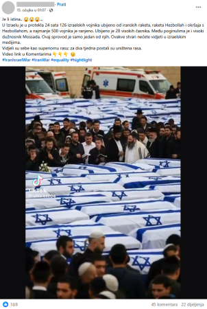 U Izraelu je u protekla 24 sata 126 izraelskih vojnika ubijeno od iranskih raketa, raketa Hezbollah i okršaja s Hezbollahom, a najmanje 500 vojnika je ranjeno. Ubijeno je 28 visokih časnika. Među poginulima je i visoki dužnosnik Mossada. Ovaj sprovod je samo jedan od njih. Ovakve stvari nećete vidjeti u izraelskim medijima.