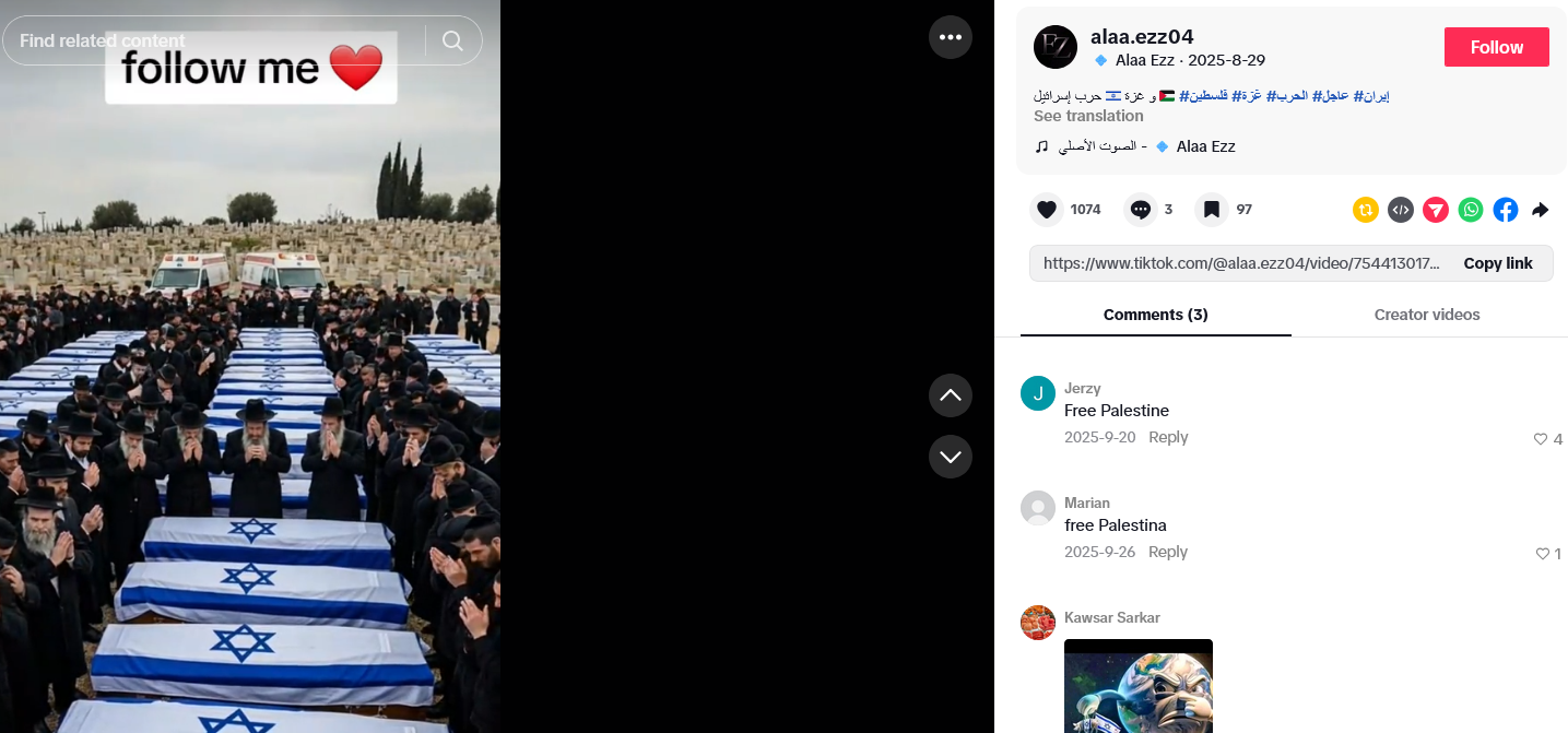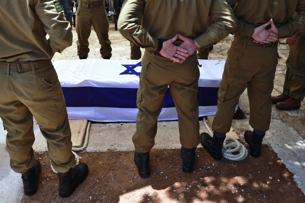 U post je umetnuta slika lijesova prekrivenih izraelskim zastavama, okruženih židovskim vjernicima u molitvi.