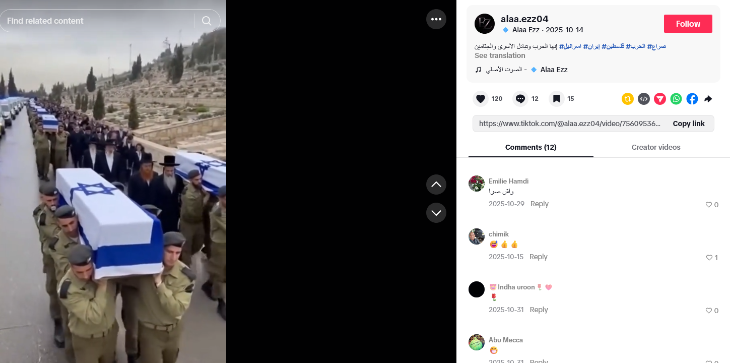 Na fotografiji je vidljiv vodeni žig TikToka i korisnika “alaa.ezz04”. Posjetili smo taj profil i pronašli uglavnom zabavne sadržaje generirane alatima umjetne inteligencije (1, 2, 3). Među njima su i sintetičke snimke koje prikazuju ukope izraelskih vojnika, veoma sličnih prizora kao na gornjoj slici (1, 2, 3, 4).