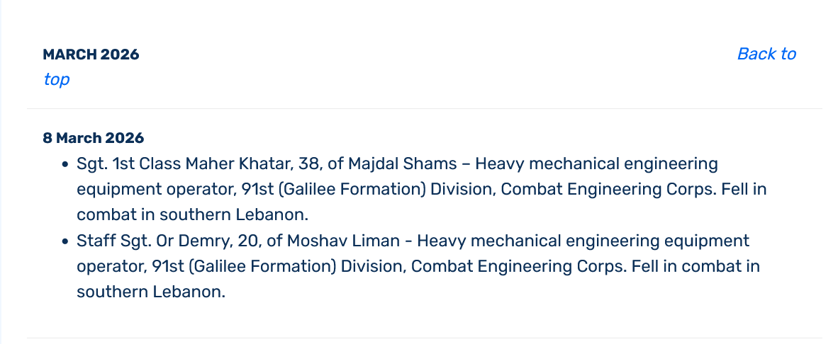 Broj poginulih izraelskih vojnika ostaje nizak u usporedbi s civilnim žrtvama (kao i u usporedbi s drugim zaraćenim stranama), prema službenim izjavama Izraelskih obrambenih snaga (IDF). Trenutno su na stranicama IDF-a evidentirana dva vojnika koja su ovog mjeseca poginula u Libanonu (1, 2), dok agencija Reuters govori o četiri vojnika.