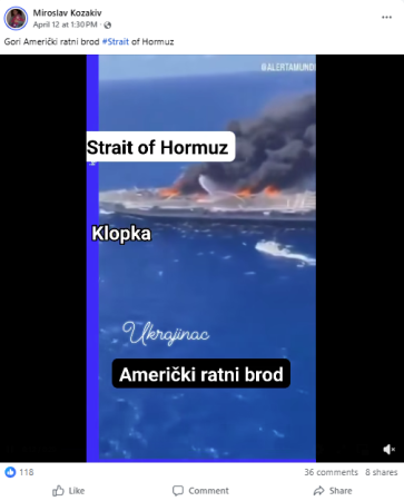 Velika prisutnost američke vojske, što u bazama, a što na moru u regiji, dovela je i do toga da se društvenim mrežama šire i dezinformacije vezane uz ratni sukob u Iranu. Tako je na Facebook profilu privatnog korisnika 12. travnja objavljen video (arhivirano ovdje) koji navodno prikazuje požar na američkom ratnom brodu u Hormuškom tjesnacu: