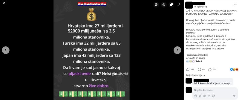 Od siječnja ove godine profilima na Facebooku širi se fotografija na kojoj je navedeno da “u Hrvatskoj ima 27 milijardera i čak 52 tisuće milijunaša na 3,5 milijuna stanovnika“.