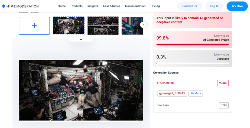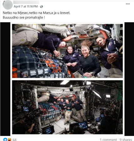 NASA-ina misija Artemis II nije snimljena u studiju, niti ima dokaza da je izrežirana. Donja fotografija kolaža je očito generirana umjetnom inteligencijom. Naime, unutar astronautove ruke na lijevoj strani fotografije je neobična i uvučena udubina. Lica dvaju astronauta su potpuno izobličena. Žena s lijeve strane, pored afroameričkog astronauta – prsti su joj iskrivljeni, a prednji dio lijevog stopala je okrenut prema van, iako joj je potkoljenica usmjerena ravno.