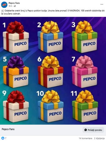 Facebookom se ponovno širi poziv na lažnu nagradnu igru, navodno u organizaciji trgovačkog lanca Pepco. Kao i prošlih puta, uvjeti sudjelovanja su jednostavni: korisnik treba izabrati jedan od nekoliko paketića ili omotnica sa slike i ući u natjecanje.