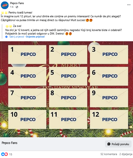 Nagradnu igru objavljuje stranica pod imenom “Pepco Fans”, a ne službena stranica Pepca. Stranica ima tek tri pratitelja. Na toj stranici stoje tek tri posta, svi pozivi na sudjelovanje u nagradnim igrama (jedan od njih je na rumunjskom jeziku). Na stranici nije naveden niti jedan relevantan podatak: naziv i sjedište poslovnog subjekta, adresa internetske stranice i adresa elektroničke pošte.