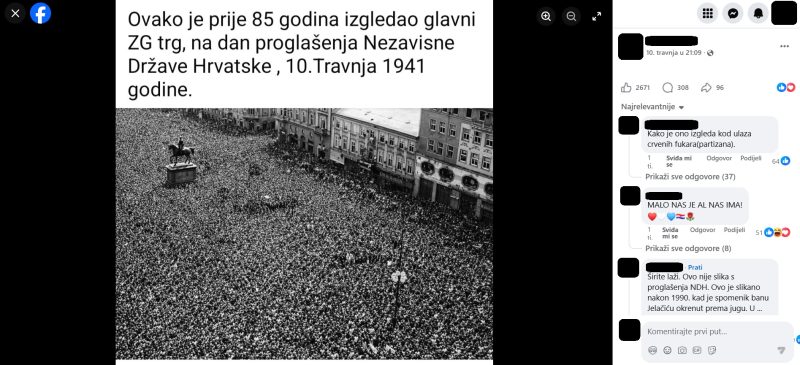 “Ovako je prije 85 godina izgledao glavni ZG trg, na dan proglašenja Nezavisne Države Hrvatske , 10.Travnja 1941 godine“, stoji u objavi koja se na društvenim danima dijelila ovog mjeseca na obljetnicu proglašenja NDH i u danima poslije nje. Citirani tekst nalazi se uz crno-bijelu fotografiju na kojoj se vidi masovno okupljanje na glavnom zagrebačkom trgu, današnjem Trgu bana Jelačića.