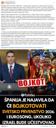 A kakva je situacija sa sudjelovanjem na predstojećem Svjetskom prvenstvu u nogometu koje će se održati u SAD-u, Kanadi i Meksiku? Društvenim mrežama proširila se informacija da će Španjolska osim Eurosonga bojkotirati i to veliko natjecanje zbog sudjelovanja Izraela u kvalifikacijama. Jedna od objava (arhivirano ovdje) na Facebook profilu privatne korisnice glasi ovako: