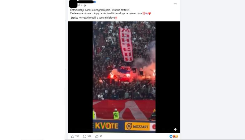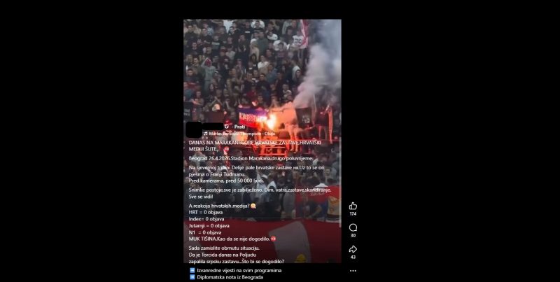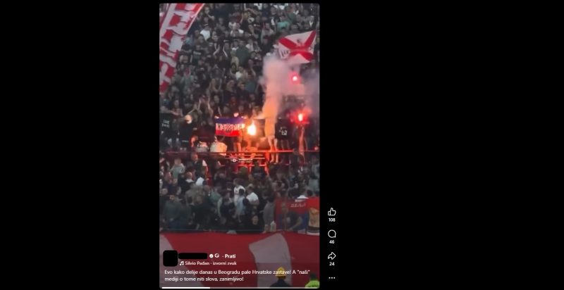 Na nekoliko Facebook profila hrvatskih korisnika u nedjelju navečer pojavila se informacija da su navijači Crvene zvezde na najvećem srpskom nogometnom derbiju protiv Partizana zapalili hrvatske zastave dok hrvatski mediji o “tome šute”, odnosno zataškavaju ili ne žele pisati o tom incidentu.