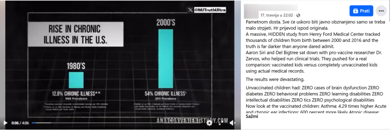 Zaključno, društvenim mrežama se od rujna prošle godine šire navodi kako cijepljena djeca imaju 2.5 puta veću šansu od razvijanja kroničnih oboljenja od necijepljene djece. Navode su plasirali američki političari na saslušanju pred Senatom gdje su govorili o studiji koju je radila zdravstvena klinika Henry Ford. Međutim, zbog brojnih metodoloških problema sama klinika nikada studiju nije objavila te se od iste i ogradila. Navedeni podaci koje klinika ima bi mogli čak biti korisni da se pratila ista skupina djece sa istim ili sličnim karakteristikama ili da su se pratili isto vrijeme. Zbog toga ocjenjujemo da objavama nedostaje kontekst zbog manjkavosti studije i činjenice da je nije objavila niti klinika Henry Ford.